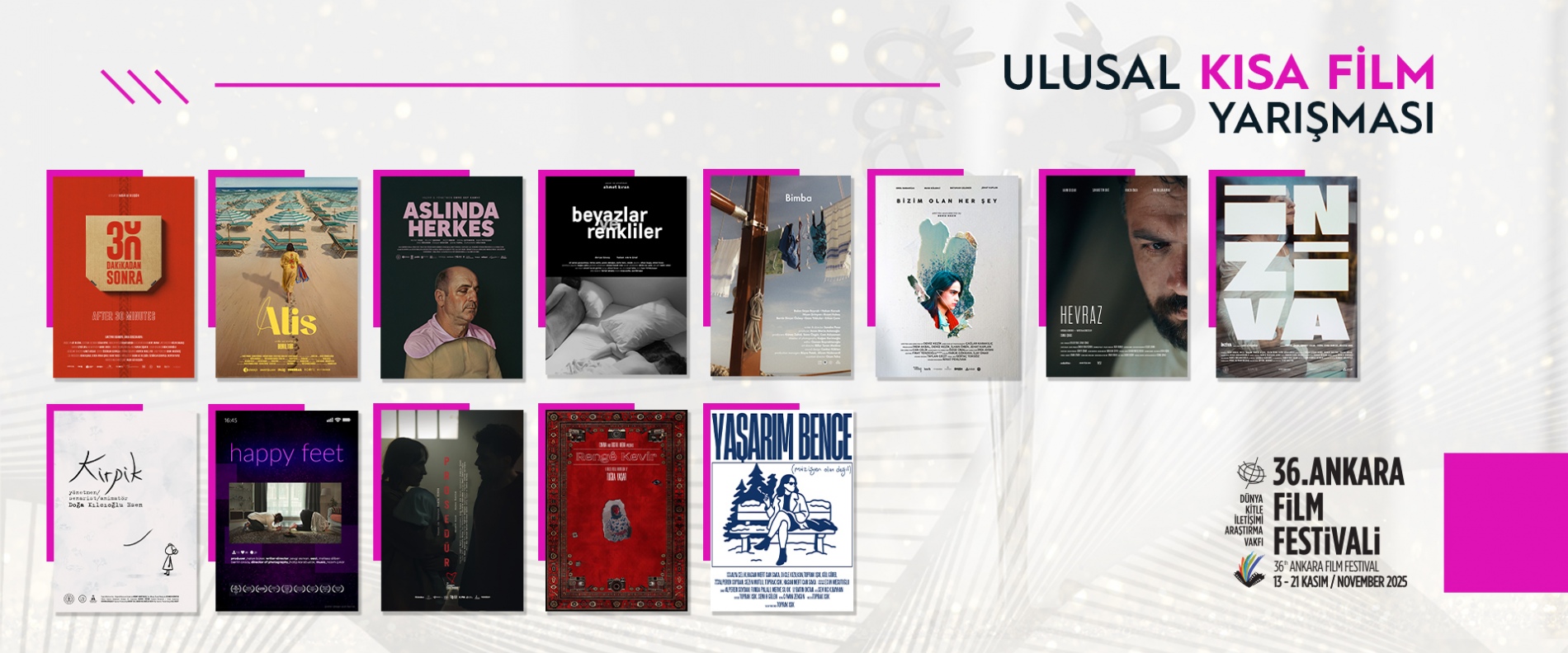 Dünya Kitle İletişimi Araştırma Vakfı tarafından düzenlenen ve bu yıl 13-21 Kasım 2025 tarihlerinde gerçekleşecek 36. Ankara Film Festivali’nin Ulusal Kısa Film Yarışması’nda yarışacak filmler belli oldu.
